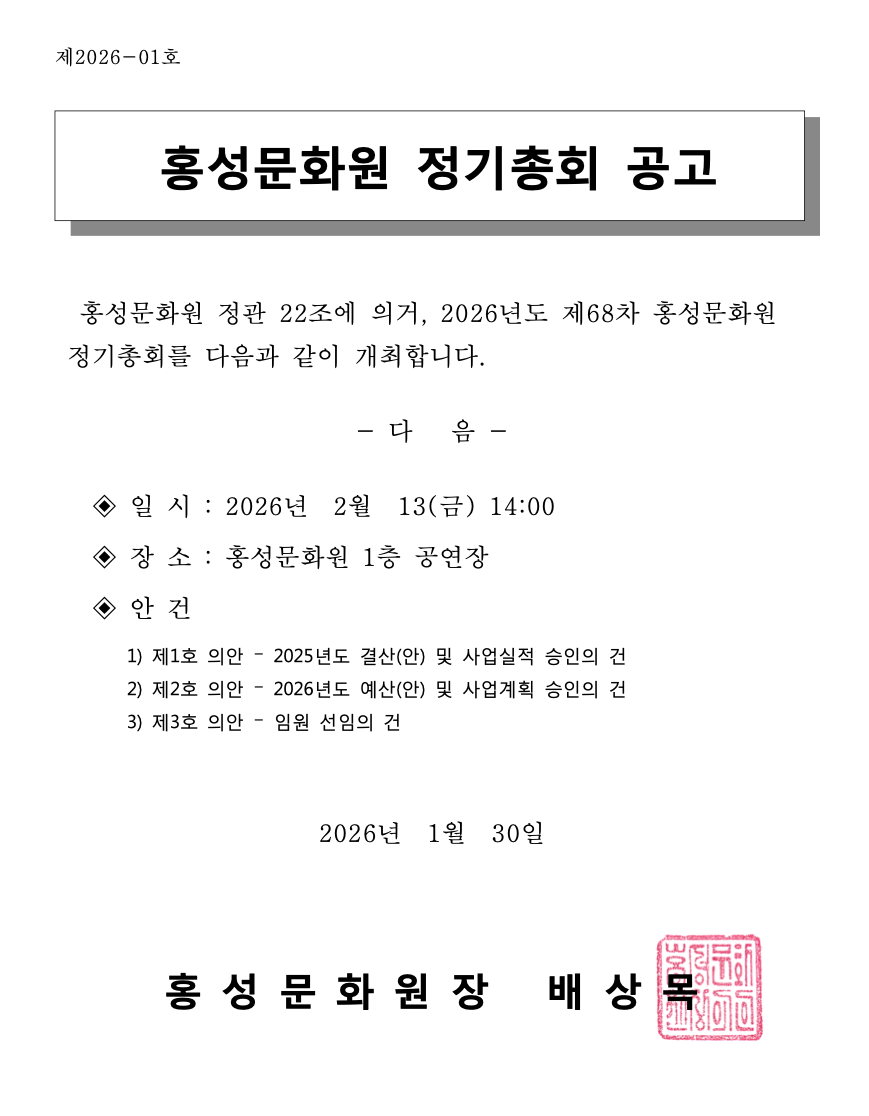 홍성문화원 정기 총회 공고